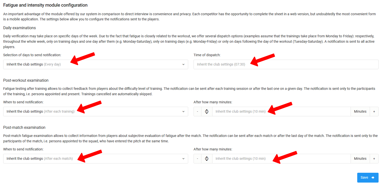 The configuration of notifications is based on the three types of them. In case of a daily survey, you have the following options in the selection field of the days the player is going to be notified: off, daily, on training days + day after, only on training days or only on days after training. For post-match and post-training fatigue analysis you have two options to send the notification: after each match/training or after the last match/training of the day. Moreover, you need to set the notification time (daily test) and the time in minutes after the workout/match. After completing the data in all fields, click on the blue "save" button.
