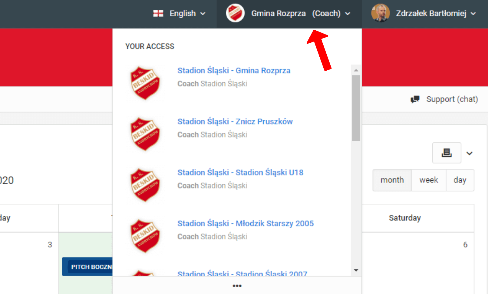 The system gives you the opportunity to have more than one role. This means that with one login and password, you can use the system as: parent, player, coach, coordinator or main administrator of the club. To switch between your roles, click on the button with your currently loaded role in the top right corner. The next step is to select the role you want to load as active. Changing a role may result in a change in the access level of the system. A more detailed list of roles can be found in the left menu under "Accesses".