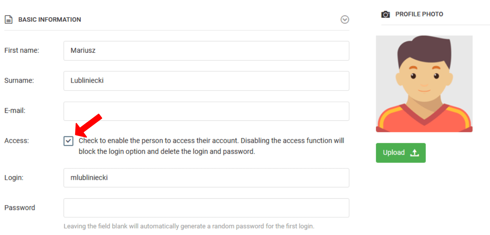 and you will also be able to change data such as name, surname or e-mail. From here you can give the player access to the system. Just check the grey checkbox and the system will generate a login and password for the player. The profile can also be edited by the player's parent.