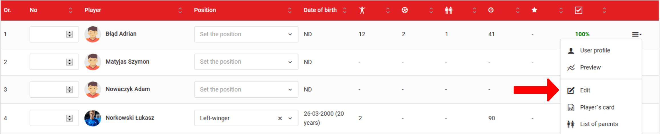 To edit a player's profile, click on the "edit" item in the function menu for that player. From here you will be able to, for example, add a picture of the player,
