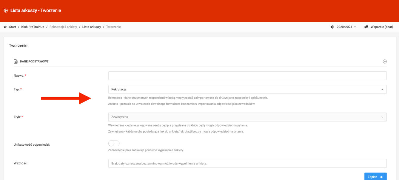 When you access the form creation tab, start by giving it a name and select the type. The first type is the recruitment form which is external by default, which means it will be made in the form of a public link website. This type of form is accessible without logging into the ProTrainUp system. Such form can be put on a website or social media.
