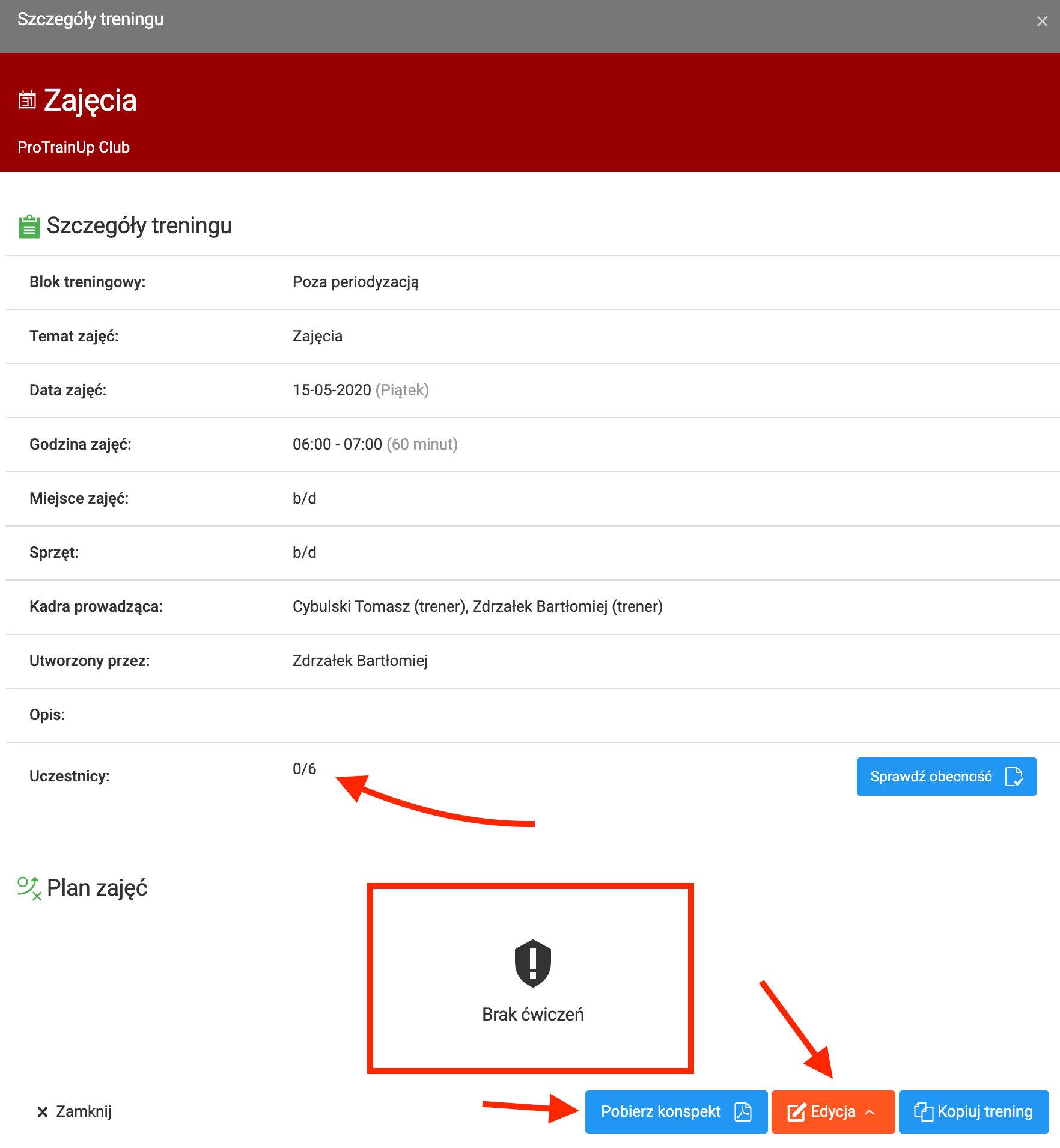 Jako administrator masz również możliwość pobrania konspektu treningowego w formie pliku PDF. Ponadto będziesz mógł również edytować parametry treningu takie jak: temat, opis, miejsce, godzina cz też data zajęć.