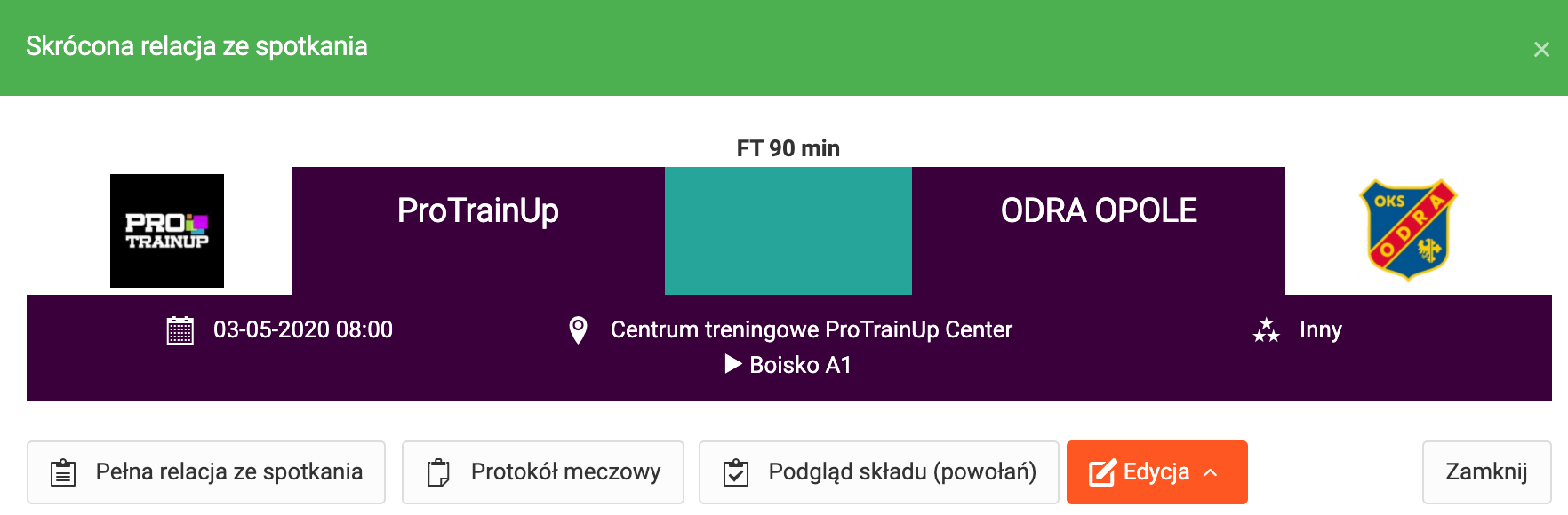 Drugim typem wydarzenia, które możesz zaplanować jest trening. Jako administrator, masz możliwość zaplanowania treningu wybranej drużynie. Temat planowania treningu omawialiśmy we wcześniejszych rozdziałach.